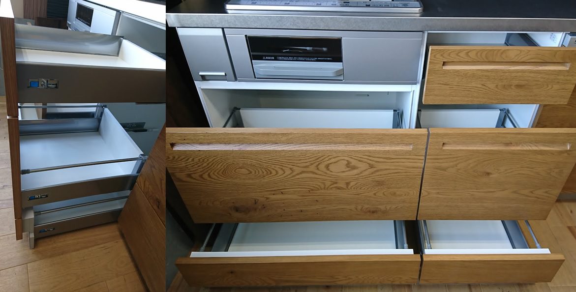 ※堅実な定型キャビネットですが、レールはハイブランドキッチンと同じソフトクローズレールを採用しております。